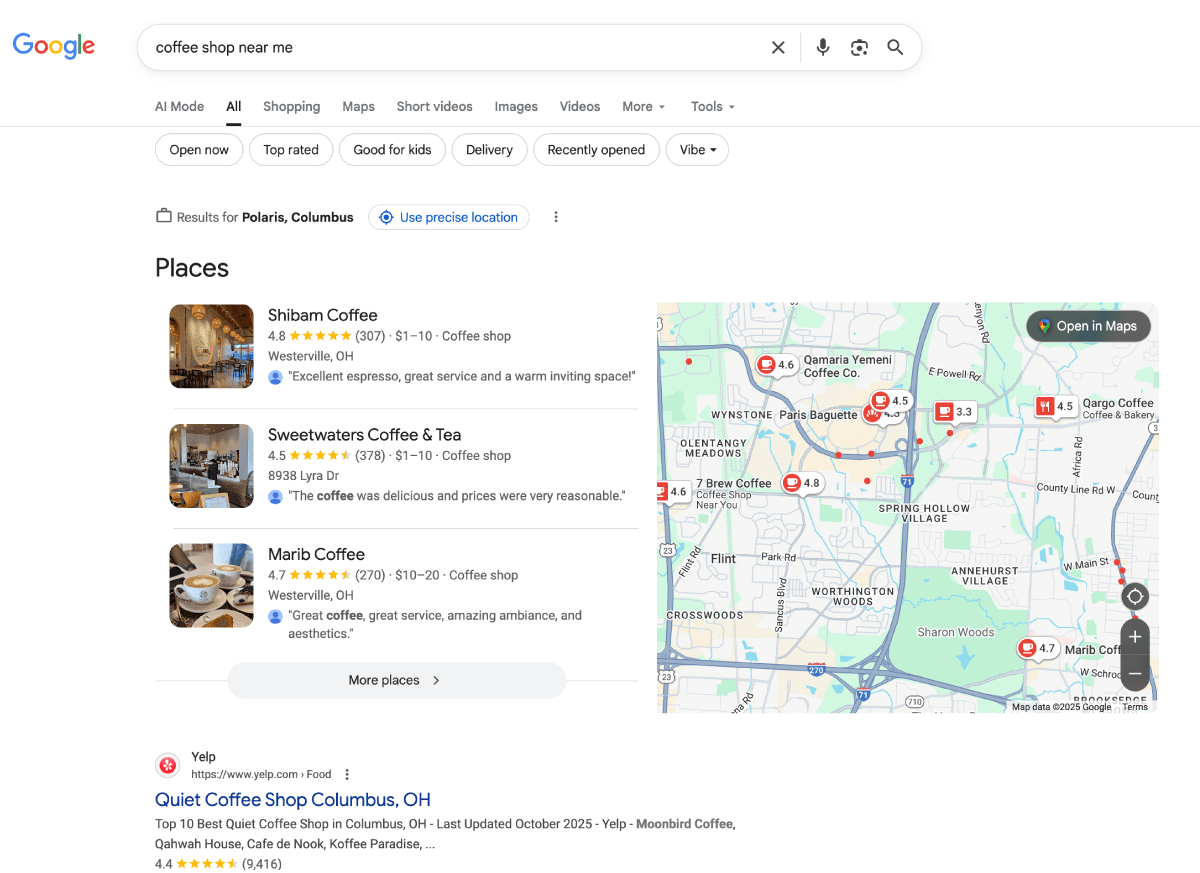 The “near me” phrase, or any keywords that indicate the user wants a business close to their current location, generates a list of local businesses in the search results. The local businesses that best match the query and use best practices for local SEO will show up in the Local Pack.